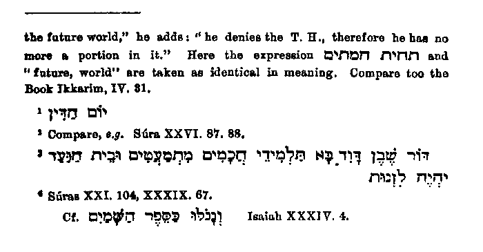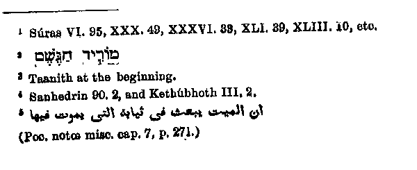 the doctrine of the day of judgment, the view of the resurrection and of the quickening of the dead was also formed; and this the more readily, because it found support in expressions in the Scripture, as e.g those in Ezekiel, xxxvii.:1 "I have opened your graves, and caused you to come up out of your graves, ye shall live," etc.; and those in other passages referring partly to the metaphorical quickening of the dead land of Israel. Of this doctrine it is said that it is such a fundamental teaching of the Jewish faith that the declaration that it did not belong to the law entailed the exclusion of him who thus spoke from eternal life.2 The Quran is, so to speak, founded upon this doctrine along with that of the unity of God, and there is scarcely a page in it where this doctrine is not mentioned. To adduce proofs here would be as easy as it would be useless; and indeed it is not required by our purpose, since Christianity also has inherited this view from Judaism, as is shown in the argument of Jesus in refutation of the Sadducees. Only one point deserves particular mention, because on the one hand it contains a detail adopted from Judaism, and on the other it shows the low level of thought at that time.