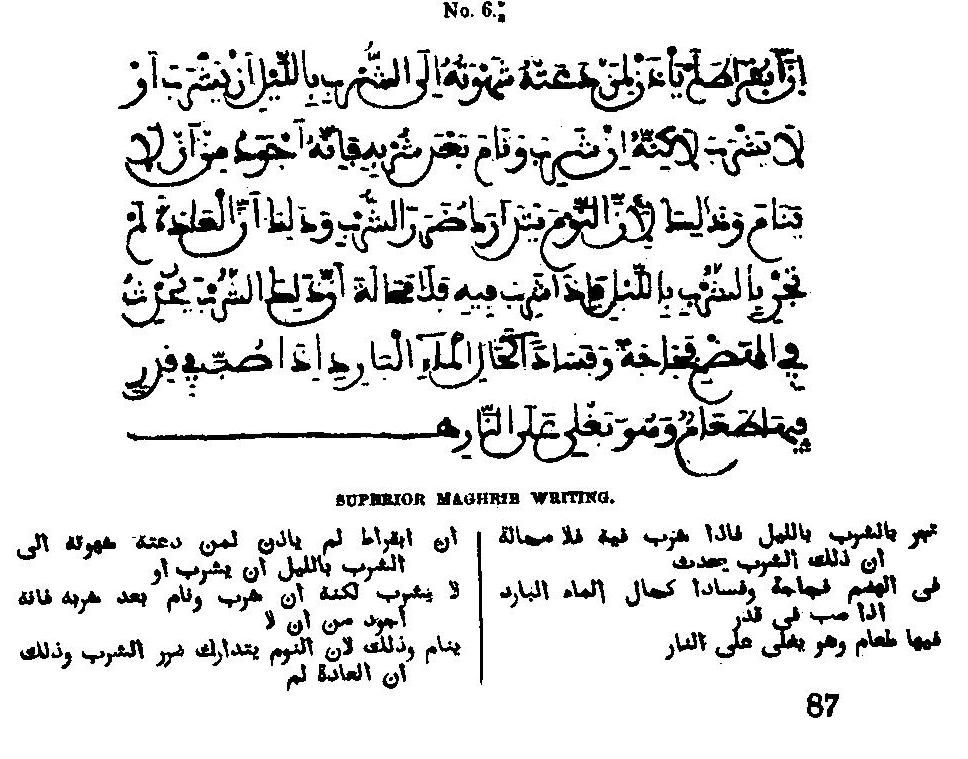 . This tallies with a remark of Hall Khalifah, according to which the diacritical point; of these two letters may be put or omitted ad libitum; and we seem therefore justified in concluding that the necessity for their distinction was latest felt and provided for. Hence arises one of the peculiarities which at once mark the difference between the Western and Eastern styles of writing, and which the reader will observe in the next three specimens presenting instances of the Maghrib manuscript character.